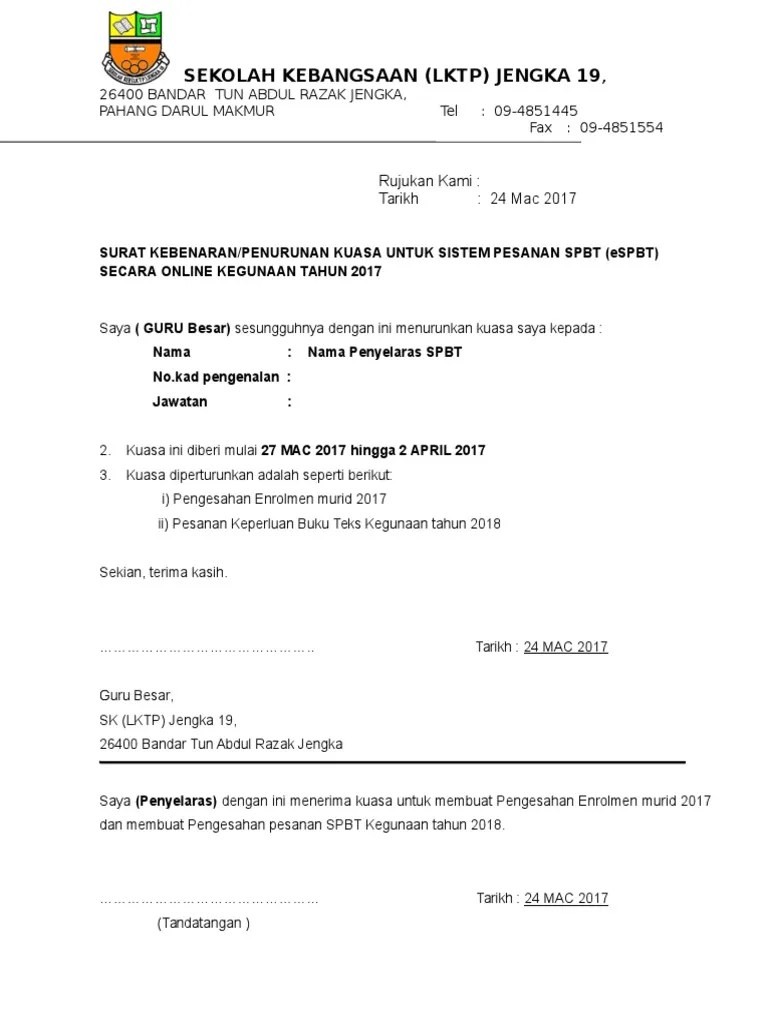 7) tandatangan dan cap rasmi ketua jabatan. Contohnya kamu sakit keras dan tidak bisa turun dari ranjang atau keluar rumah. Stempel atau cap dari instansi dan lembaga terkait. 3.4 surat/memo arahan untuk menguruskan pembayaran di bawah ap 59. Alamat sekolah , no telefon dan logo. Contoh surat kuasa pengambilan uang di bank.