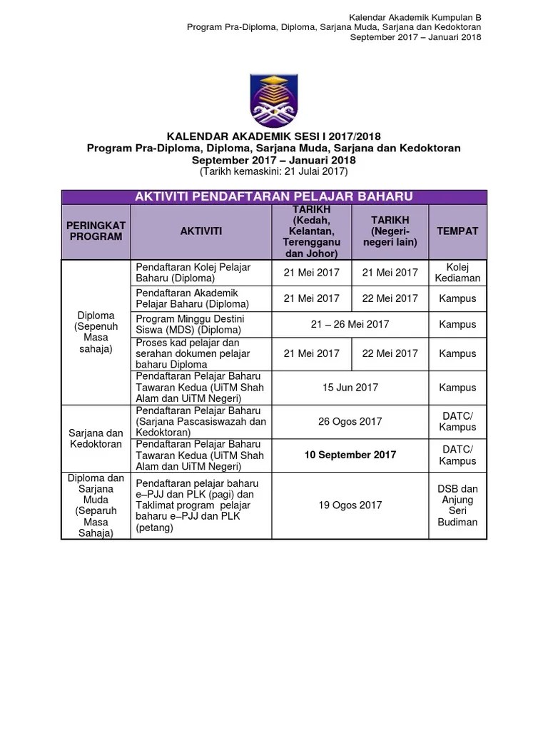Kalendar Akademik Uitm 2017 - Download. Pendaftaran kolej pelajar baharu (lepasan diploma uitm). Academic calendar 2017/2018 academic year first semester level 200, 300 & 400 and graduate students activity date students report. Find out when lectures and examinations will be conducted. The academic calendar for universiti teknologi mara (uitm) 2016/2017 is out now. Revocation of student status (students will be given a gt status).